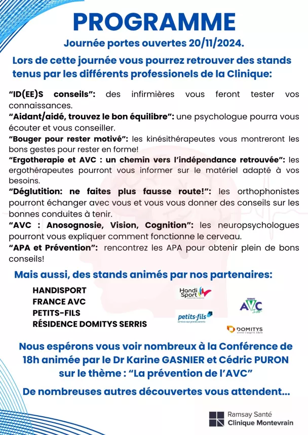 JOURNEE MONDIALE DE LUTTE CONTRE L'AVC - MERCI DE VOTRE PARTICIPATION ! RECAPITULATIF DE LA JOURNEE PORTES OUVERTES 2024 Un Centre expert pour la rééducation neurologique et orthopédique Vidéo distante URL